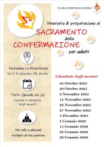 L’itinerario 2025 / 2026 di preparazione al Sacramento della Confermazione per adulti si terrà presso la Parrocchia La Resurrezione in via S. Di Giacomo, 79 – Aprilia